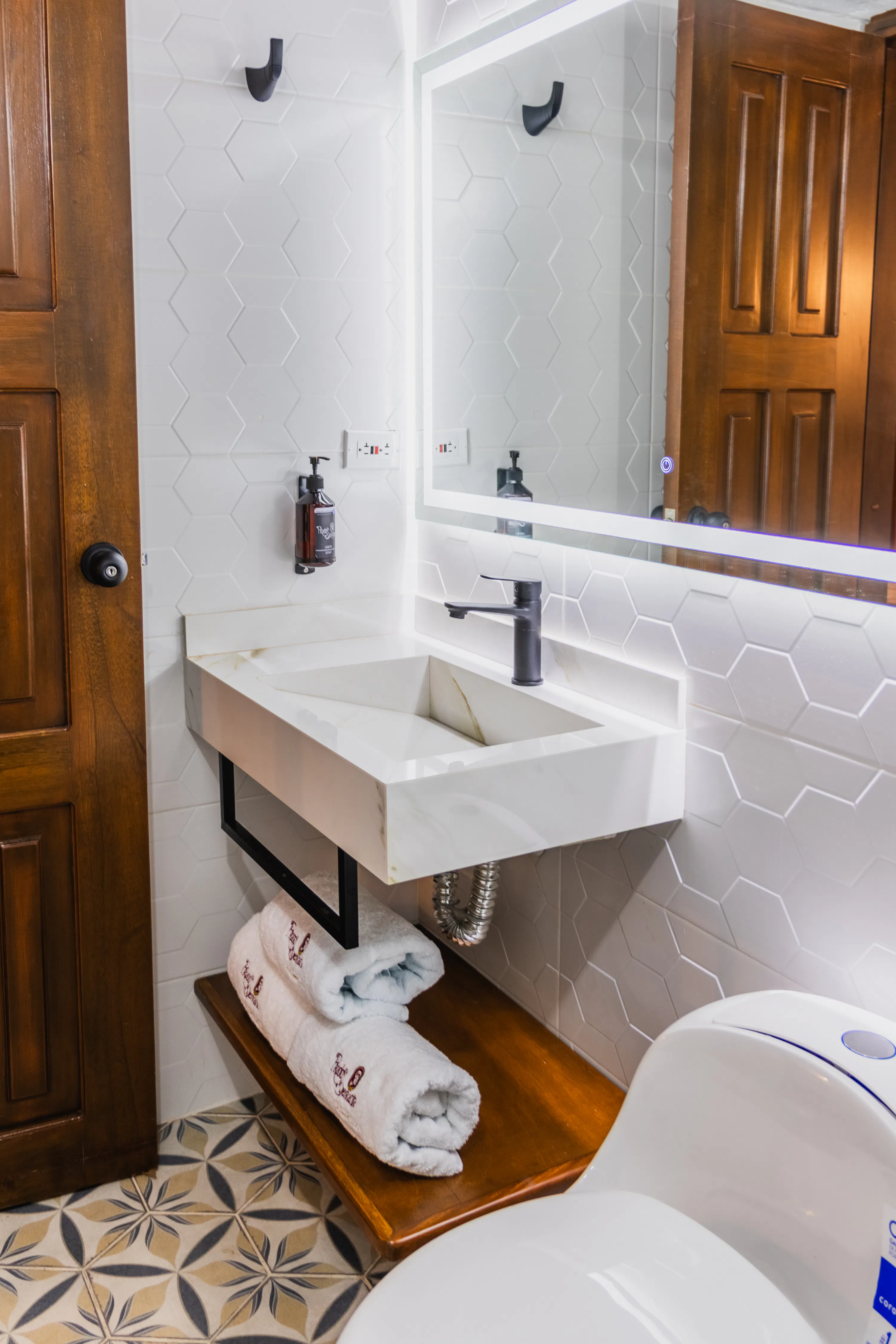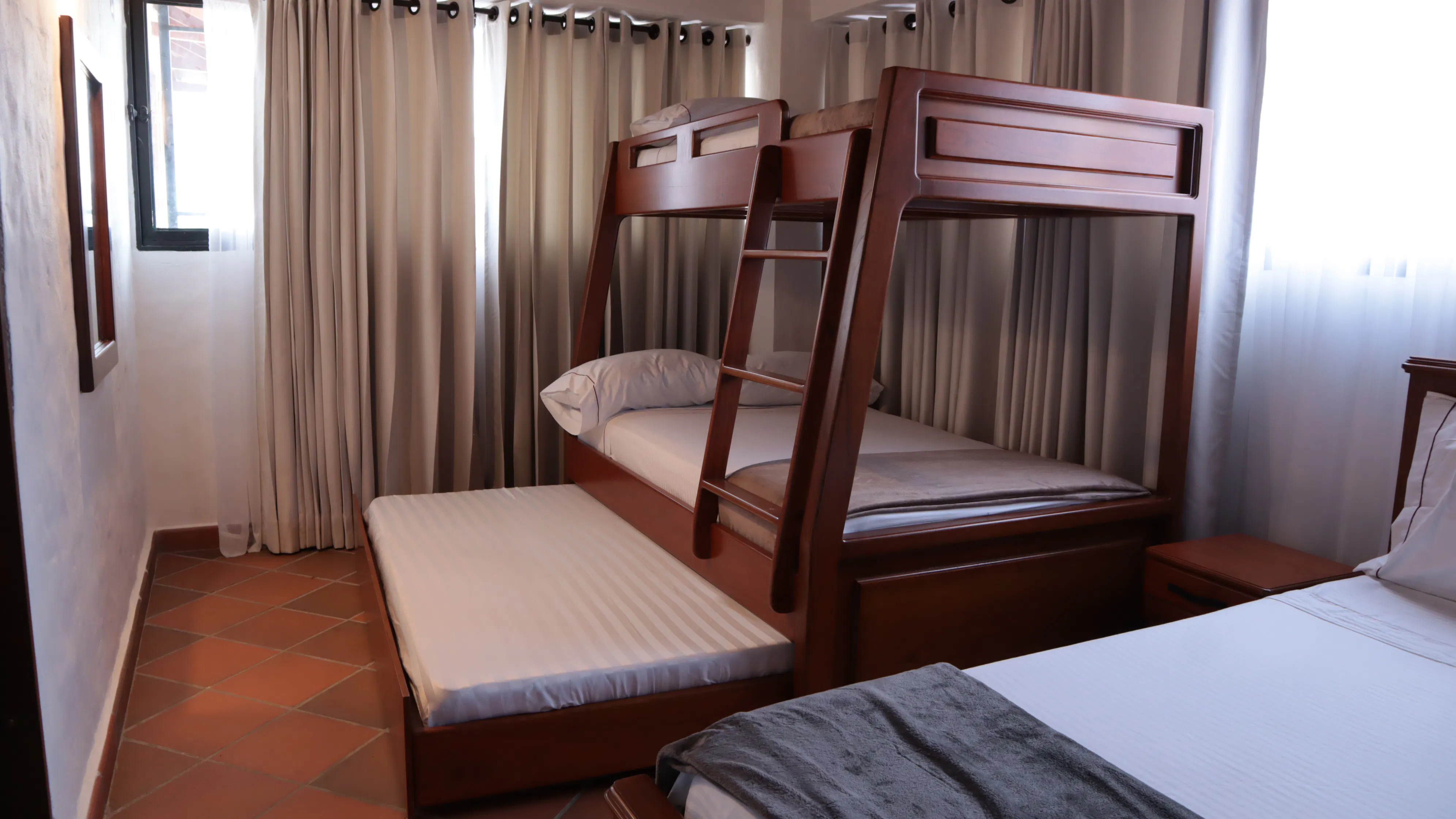 Enjoy a spacious and comfortable stay, perfect for families or groups. The room features a double bed (1.40 m) and a triple bunk bed with semi-double mattresses, tower fans, desk, private bathroom, television, and Wi-Fi connection.